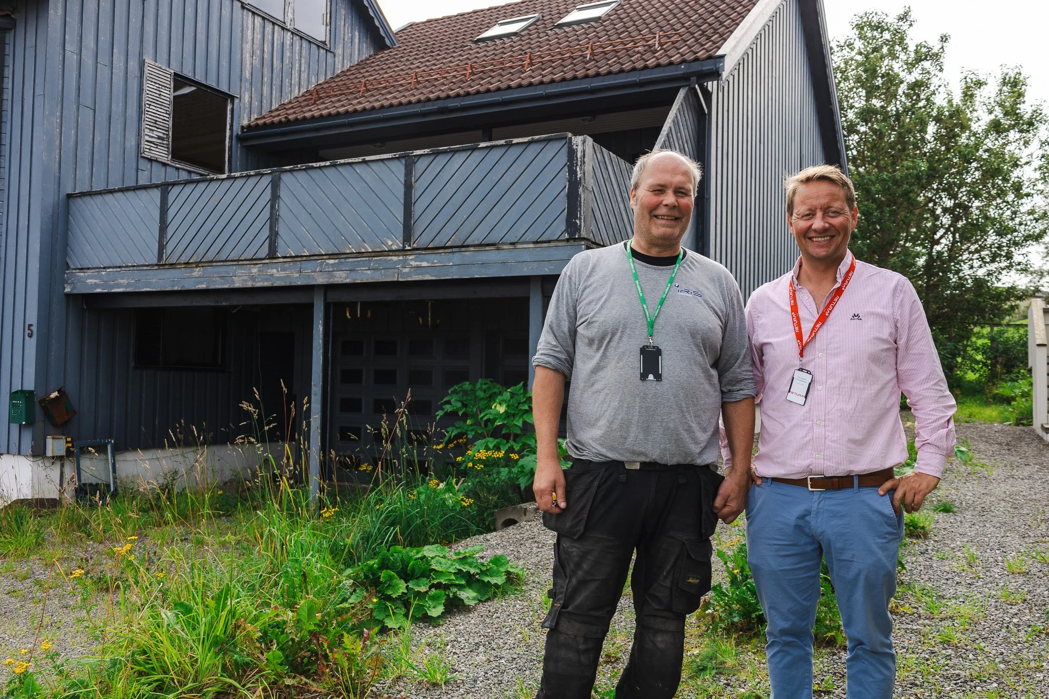 Prosjektleder Jens Selnes og salgssjef i Retura Iris, Ole Jørgen Nordbakken foran et av husene i ombruksgata.